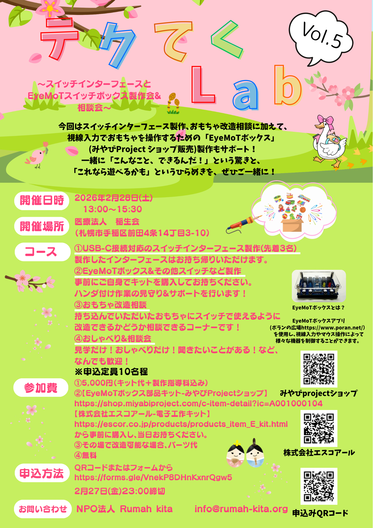 第5回目となるテクてくLab、今回もスイッチインターフェース製作、おもちゃ改造相談に加えて、視線入力でおもちゃを操作するための「EyeMoTボックス」(みやびProject ショップ販売)製作もサポートします!